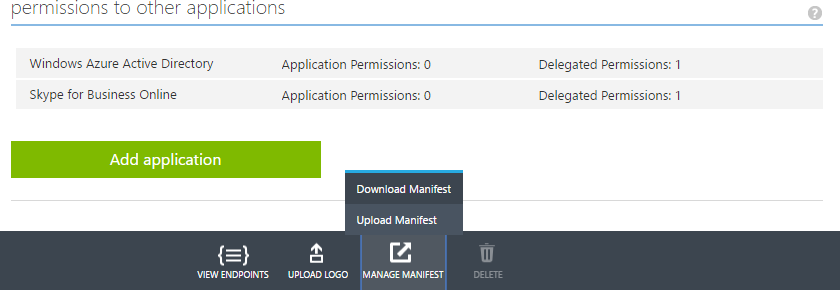 We need to access Skype for Business Online, so we need to specify that our app requires this access. It is done by going to the newly created application -> Configure -> scroll down to "permissions to other applications" -> Add application.