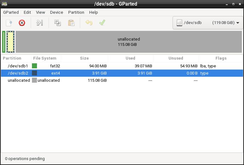 As I said above RaspAnd 14 can be installed in Windows using Rufus, Win32 Disk Imager or Etcher. This method has one disadvantage. Only about about 5GB can be used as data storage no matter which card you use. Now say, for example, that you use Micro SD card (preferable a class 10 card) of 128GB about 123GB will be “wasted”. You can, however, change that with the help of GParted. See below how to do it.