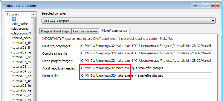 You also have to setup the working directory yourself : Project->Properties -> Build targets -> tutorial N -> execution working dir ( it’s src_dir/tutorial_N/ ).