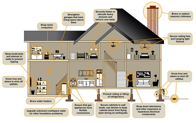 There is no mandatory federal standard that requires manufacturers to design products and provide installation guidance to prevent tip-over. It is up to homeowners and contractors to be proactive to mitigate tip-over hazards. Figure 1 shows several items around the house that can and should be anchored to prevent appliances from tipping over and other hazards from occurring in an earthquake and other natural disasters.