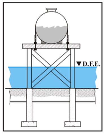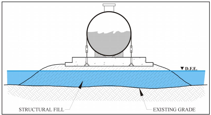 The most effective flood protection technique for fuel storage tanks is elevation of the tank above the Design Flood Elevation (DFE). The DFE is the elevation of the highest flood a protective measure is designed to withstand, usually based on the 100-year flood. In A Zones, tanks can be elevated on platforms, frames, or on structural fill. Methods to elevate tanks are shown in Figures 2 and 3 (FEMA P-348 2017). When the tank is elevated on compacted structural fill, a concrete slab is often placed on top of the fill material for anchorage. Figure 3 shows a tank elevated on fill. In V Zones and Coastal A Zones, however, structural fill is not allowed for new construction or Substantially Improved homes, as defined by the National Flood Insurance Program (FEMA P-348 2017).