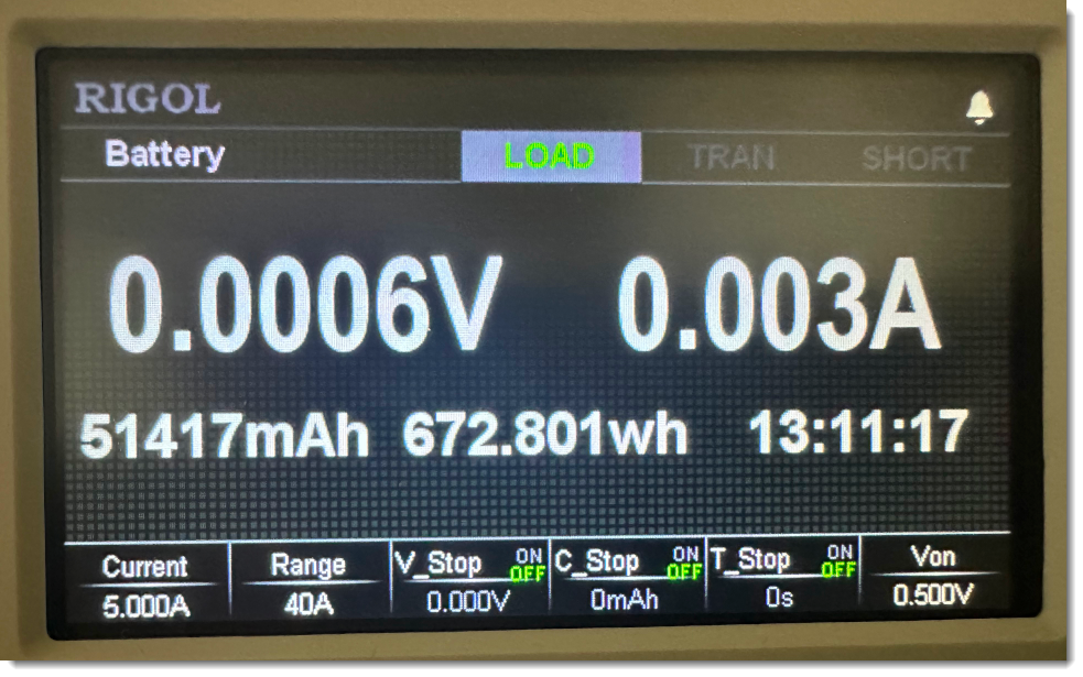 In the picture of the electronic load screen, one can see 1493 mWh: that’s for the discharge of an AA battery at 0,100 A until the voltage reaches 0,5 V. 1493 is far less than the 3400 mWh printed in a large font on each battery.