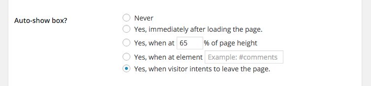 After installing & activating this add-on plugin, enabling exit intent is as simple as ticking a box on the page where you edit your box.