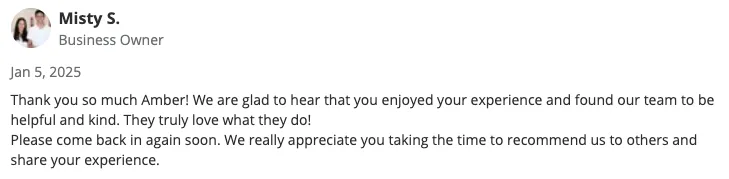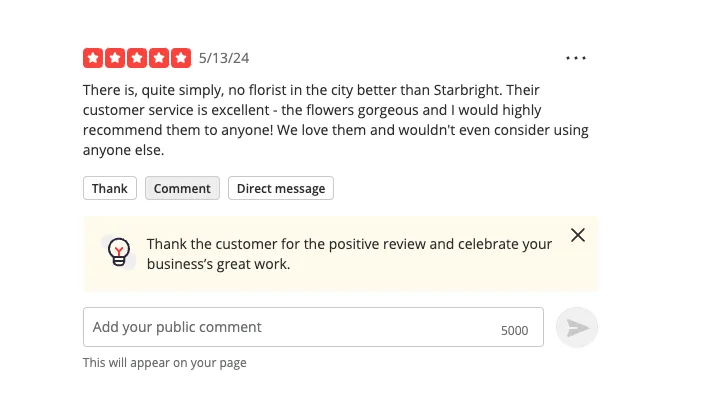 If you’re responding to a positive review, a public comment is a great way to thank the reviewer for taking the time to share their experience or highlight something in the review that you want to amplify. Personalize your response with the reviewer’s first name and at least one detail from their review.