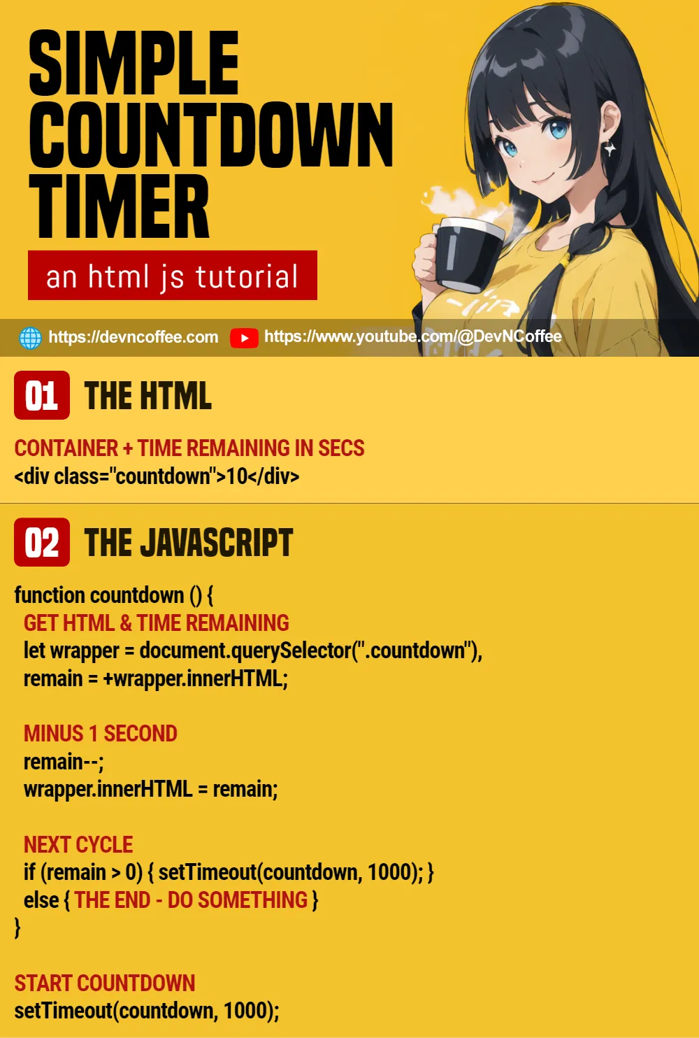 Need to create a countdown timer for your web app? Well, there’s no need to bloat your web app with complicated third-party libraries. Let Master Coffee walk you through 2 simple countdown timers, all made in pure HTML CSS Javascript – Let’s go!