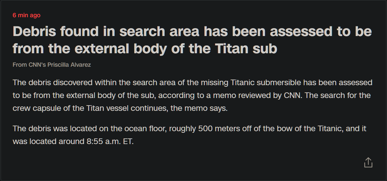 The post is so vague that it makes me think that they found one of the Titanic’s debris fields and not one of the tiny sub. It’s about the size of a van. It can hardly explode into what I would call a debris field.