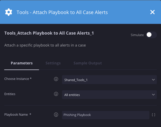 In this scenario, we’re attaching a playbook called “Phishing playbook” to all alerts in a case.
