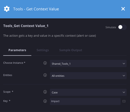 In this scenario, we’re retrieving a context value from a key called impact in a case. This action is used along with the “Set Context Value” action that adds the key value pairs to the case or alert.
