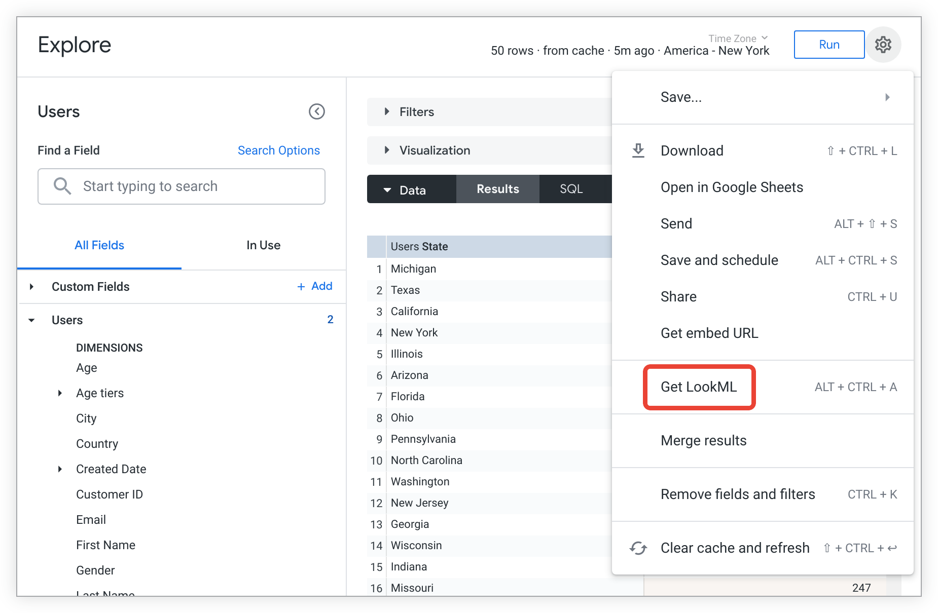 • Copy dashboard LookML of elements: You can copy the dashboard LookML from an Explore or a Look and paste it into your dashboard file.