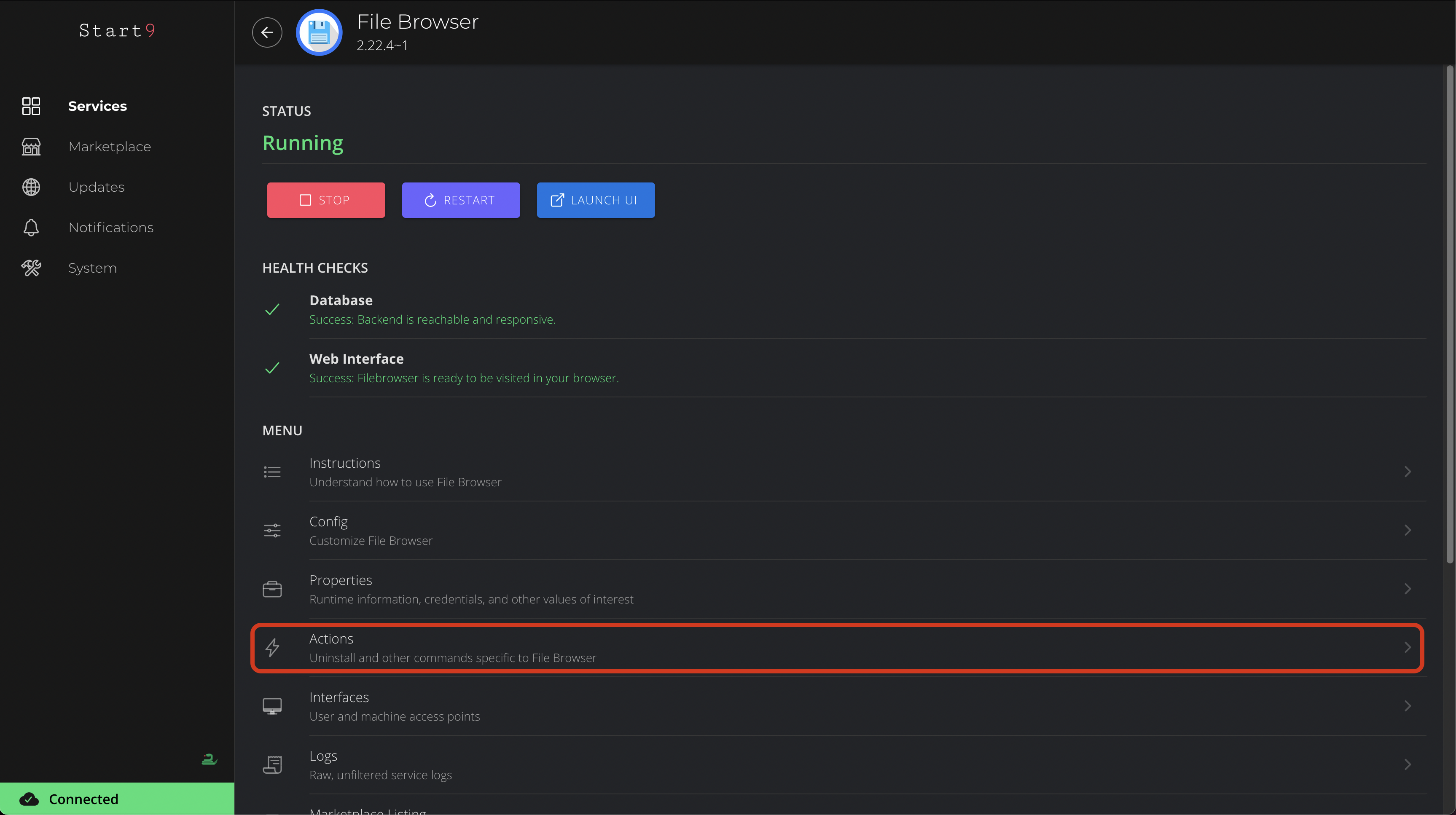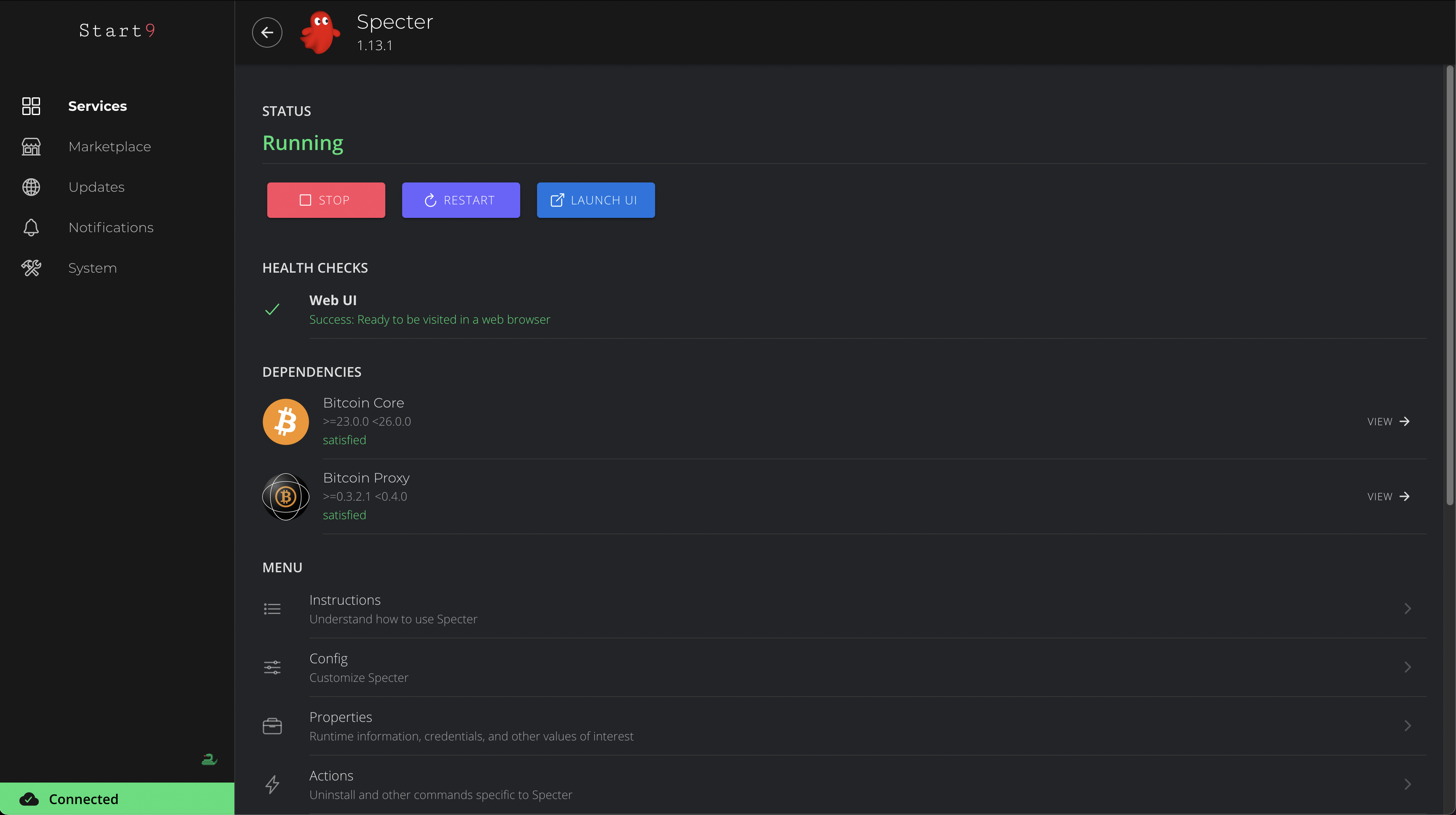 StartOS provides a rich interface for managing installed Services.