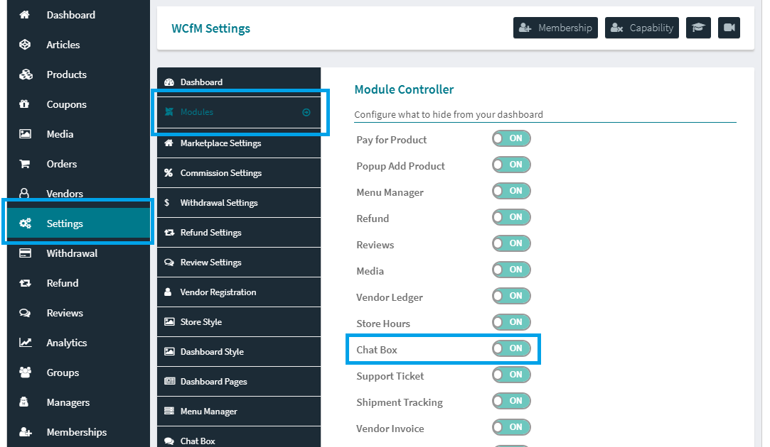 You may control “Chat Box” capability from WCFM Capability setting page.