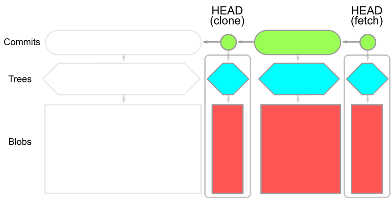 This diagram is purposefully simple, but if your repository is very large you will have many commits, trees, and blobs in your history. Likely, the historical data forms a majority of your data. Do you actually need all of it?