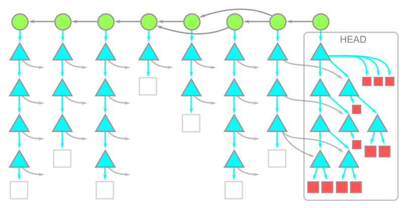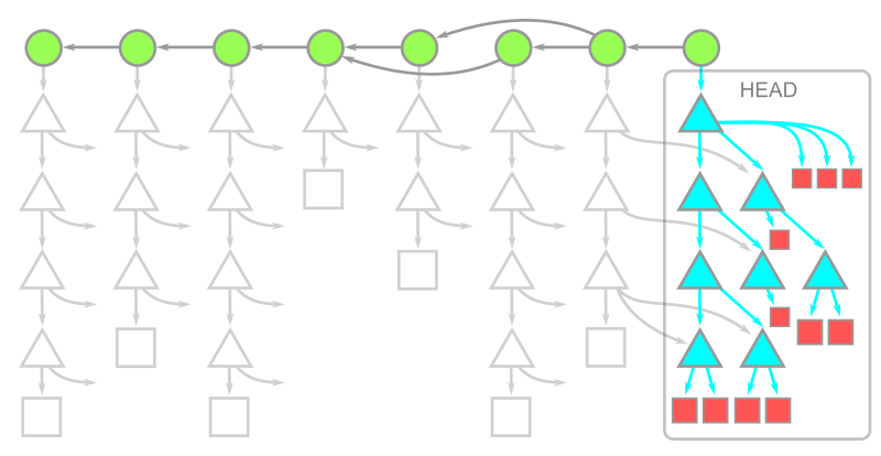 In this diagram, time moves from left to right. The arrows between a commit and its parents therefore go from right to left. Each commit has a single root tree. The root tree at the HEAD commit is fully expanded underneath, while the rest of the trees have arrows pointing towards these objects.