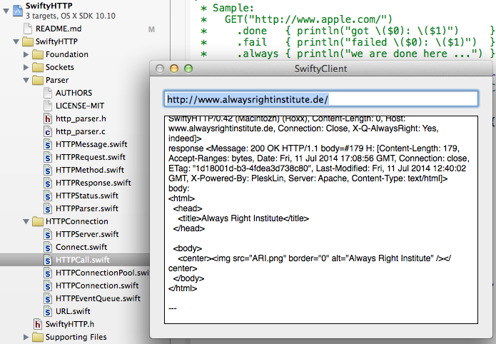 As a bonus - this also has a tiny Connect class - which is modelled after the Node.JS Connect thingy (which in turn is apparently modelled after RoR Rack). It allows you to hook up a set of blocks for request processing, instead of having just a single entry point. Not sure I like that stuff, but it seems to fit into Swift quite well. Find a sample above.