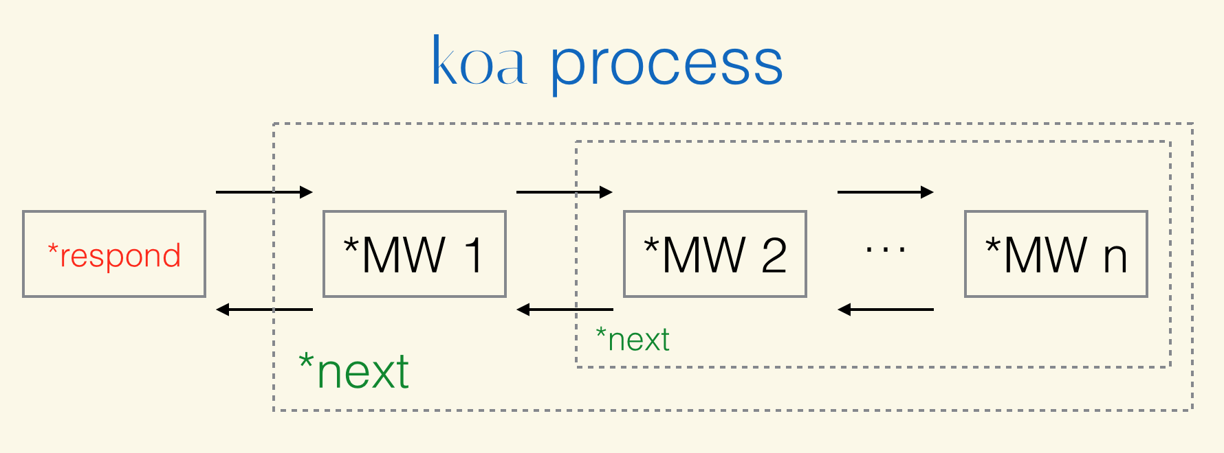 第一个中间件代码执行一半停在这了,触发了第二个中间件的执行,第二个中间件执行了一半停在这了,触发了第三个中间件的执行,然后,,,,,,第一个中间件等第二个中间件,第二个中间件等第三个中间件,,,,,,第三个中间件全部执行完毕,第二个中间件继续执行后续代码,第二个中间件代码全部执行完毕,执行第一个中间件后续代码,然后结束