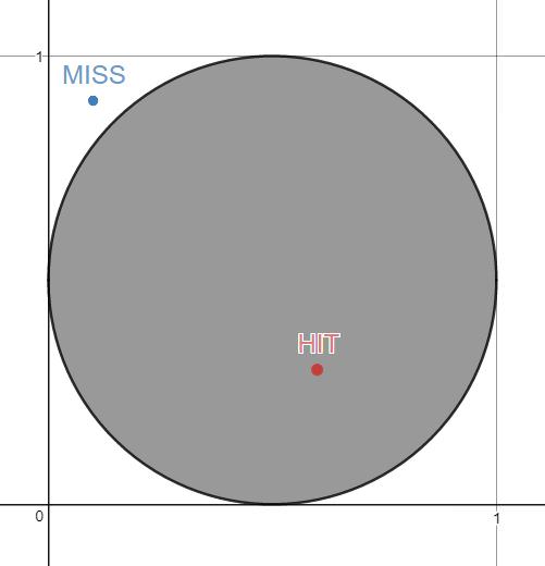 Next step would be to random a large amount of points inside the box (0,0) (1,0) (0,1) (1,1). We call each random point inside the circle a HIT and a point outside the circle a MISS. The probability of a HIT point is the area of the circle divided by the total area of the square in which we random our point in.