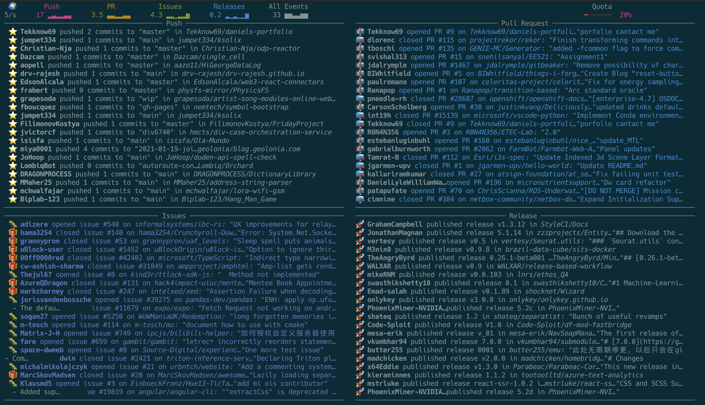 The same information as tail, but in a split window showing separately PRs, issues, pushes, and releases.