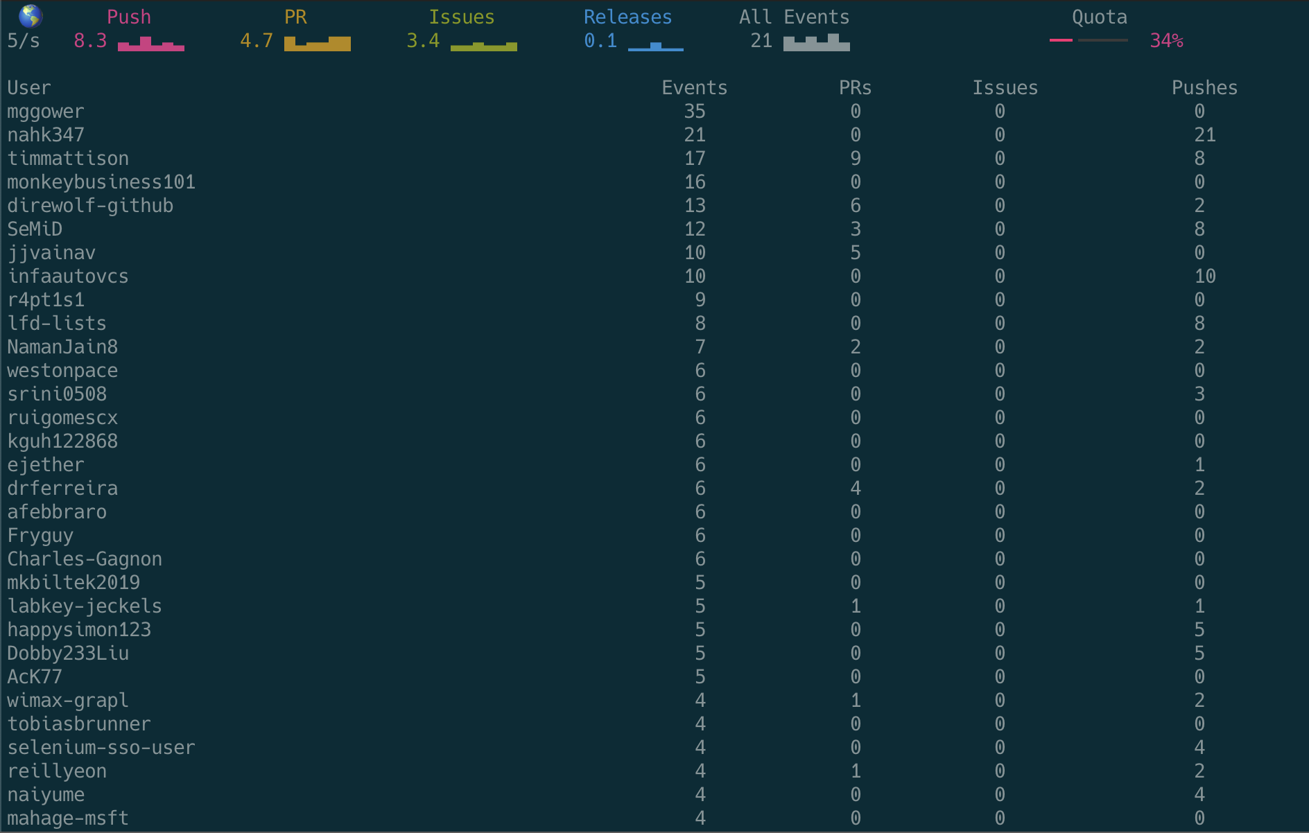 Important note: while running, ghtop will make about 5 API calls per second. GitHub has a quota of 5000 calls per hour. When there are 1000 calls left, ghtop will show a warning on every call.