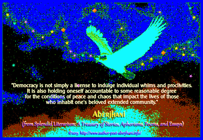 “Democracy is not simply a license to indulge individual whims and proclivities. It is also holding oneself accountable to some reasonable degree for the conditions of peace and chaos that impact the lives of those who inhabit one’s beloved extended community.”