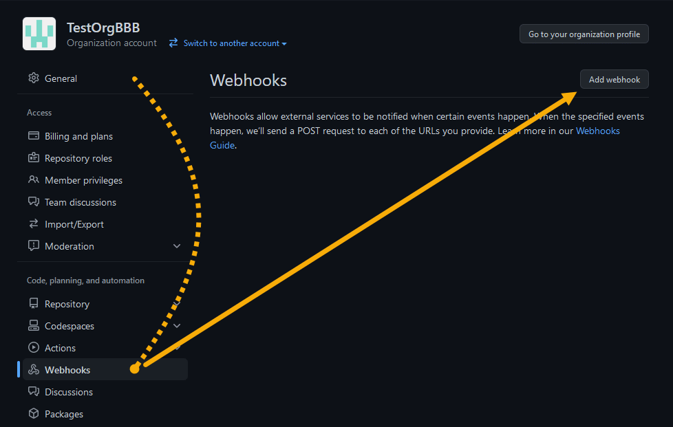 Open a new browser tab and login to your GitHub web portal to configure webhook triggers for your selected organization. Configure a webhook on your git service by performing the following steps: