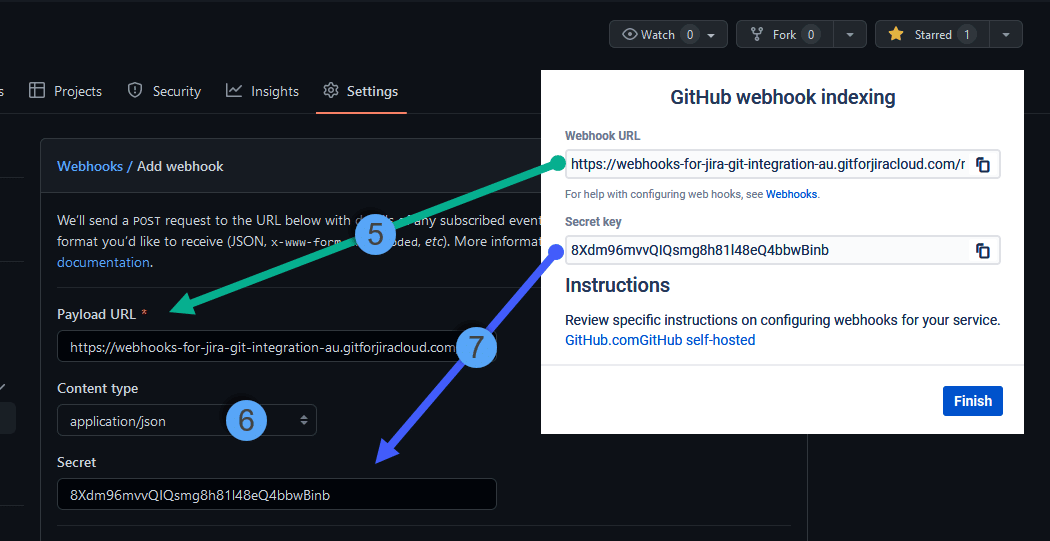 After you’re done setting up the webhook with your git service (GitHub), switch to the Jira Cloud browser tab. Click Finish to complete this setup.
