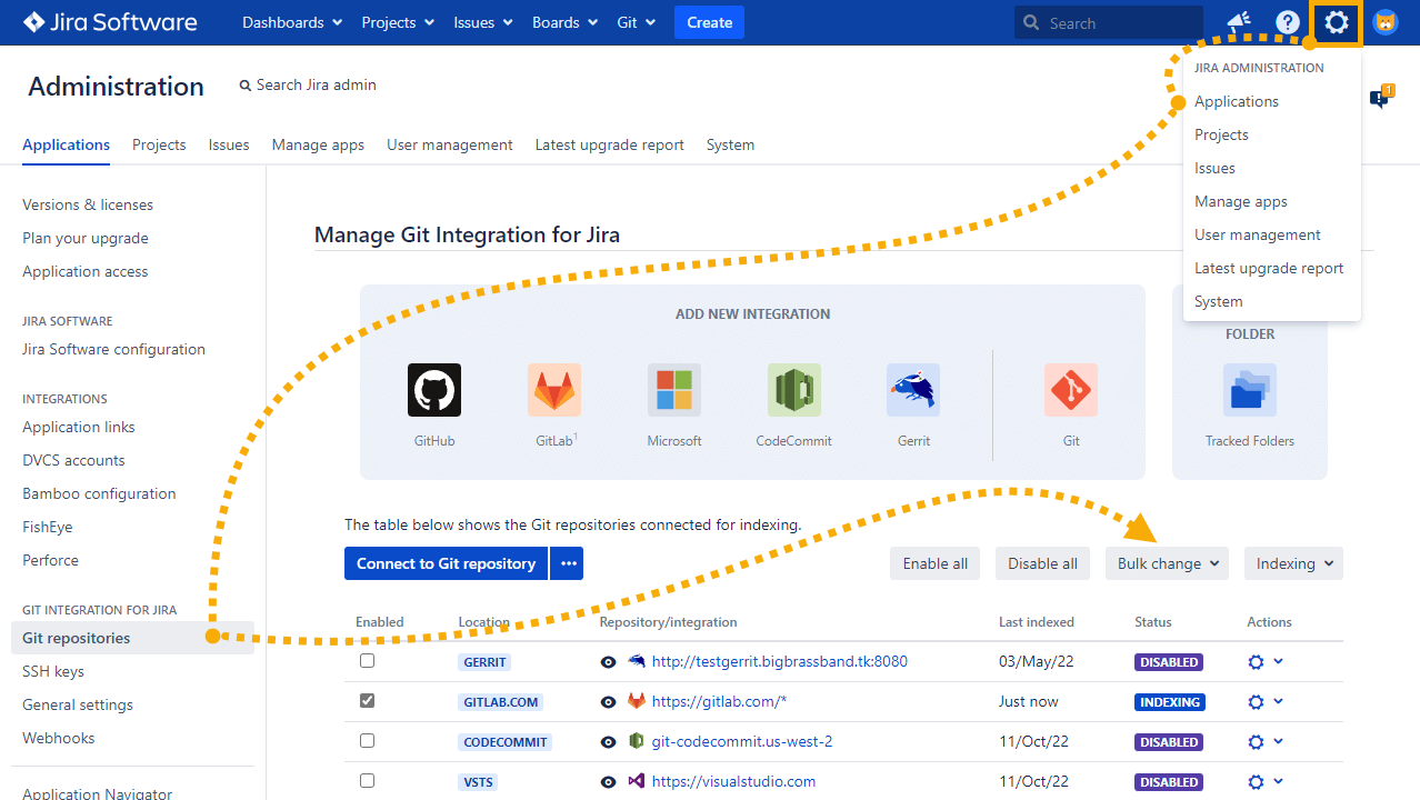 From your Jira dashboard, open the Jira Adminstration menu ➜ Applications then click Git Repositories on the sidebar. The Git Integration for Jira app repository configuration page is displayed. Use the Bulk Change dropdown to import or export git configuration.