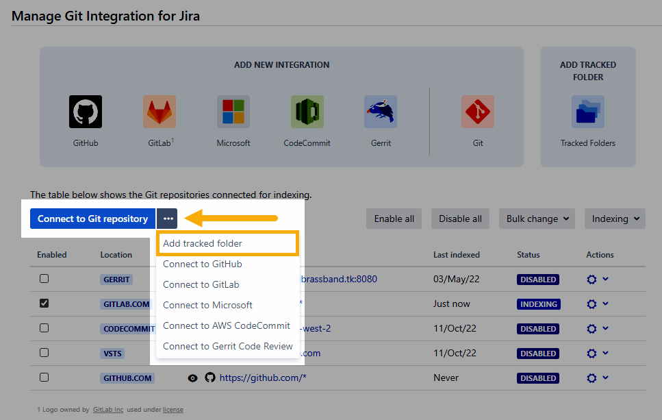 If a new repository is manually added into the local path, the Git Integration for Jira app will detect the new repository folder on the next reindex and add it into the existing tracked folder in Jira.