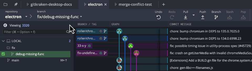 This shows active requests for merging one branch into another. With the GitHub or Bitbucket integration, new PRs can be created directly from GitKraken Desktop.