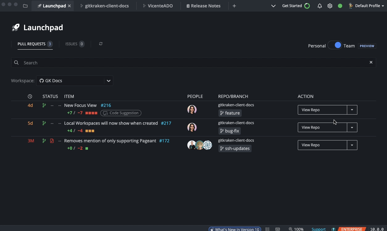 A pull request (sometimes called merge requests) is a review workflow that lets you propose changes in one branch before merging it into another. GitKraken Desktop supports creating, managing, and reviewing pull requests with integrated Git services like GitHub, GitLab, Bitbucket, and Azure DevOps.