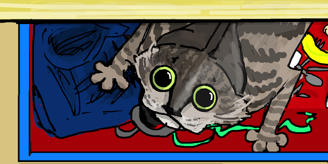 I don't know if they put the pieces together immediately, or processed them individually as they came up—"first of all, there's a cat in this drawer; How about that. Next up: there appear to be a considerable number of objects under the cat. This one is a shoe. This one is a piece of bread. This one is a credit card bill. Huh…it's addressed to 'Richard The Neighbor….'"—inching closer to the truth with every clue until the ultimate answer to "What does 'hanging out with Richard' mean?" was revealed.