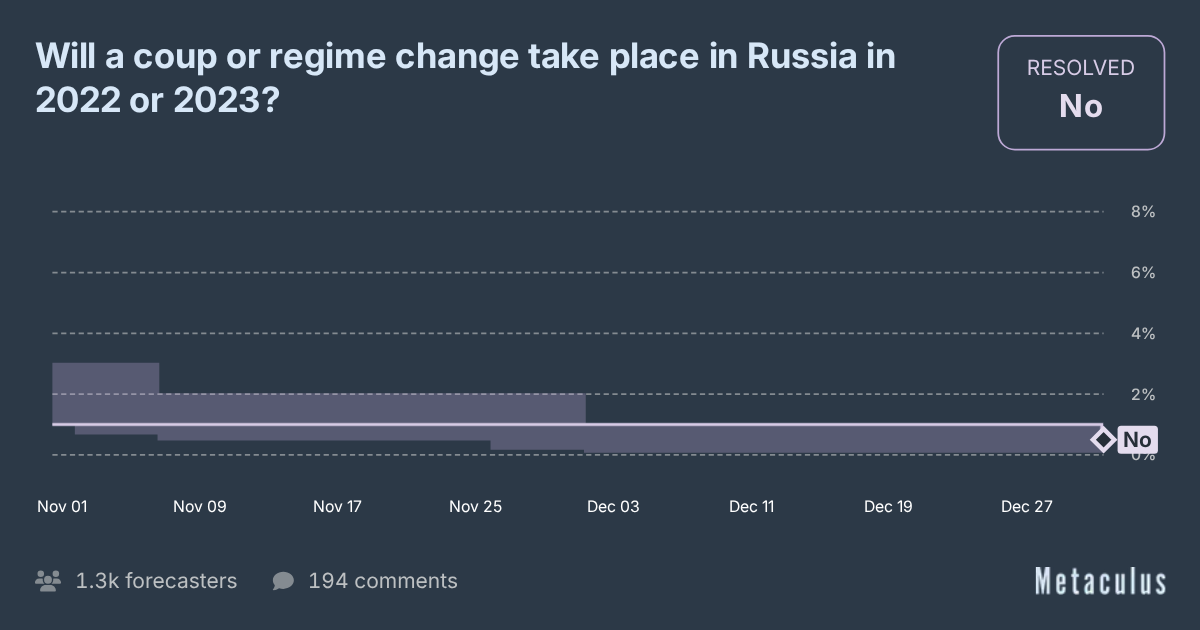 arrow-up11arrow-down1external-linkNo coup or regime change in Russia this yearplus-squarewww.metaculus.comcopacetic@discuss.tchncs.deEnglish · 3 years agomessage-square0linkfedilink