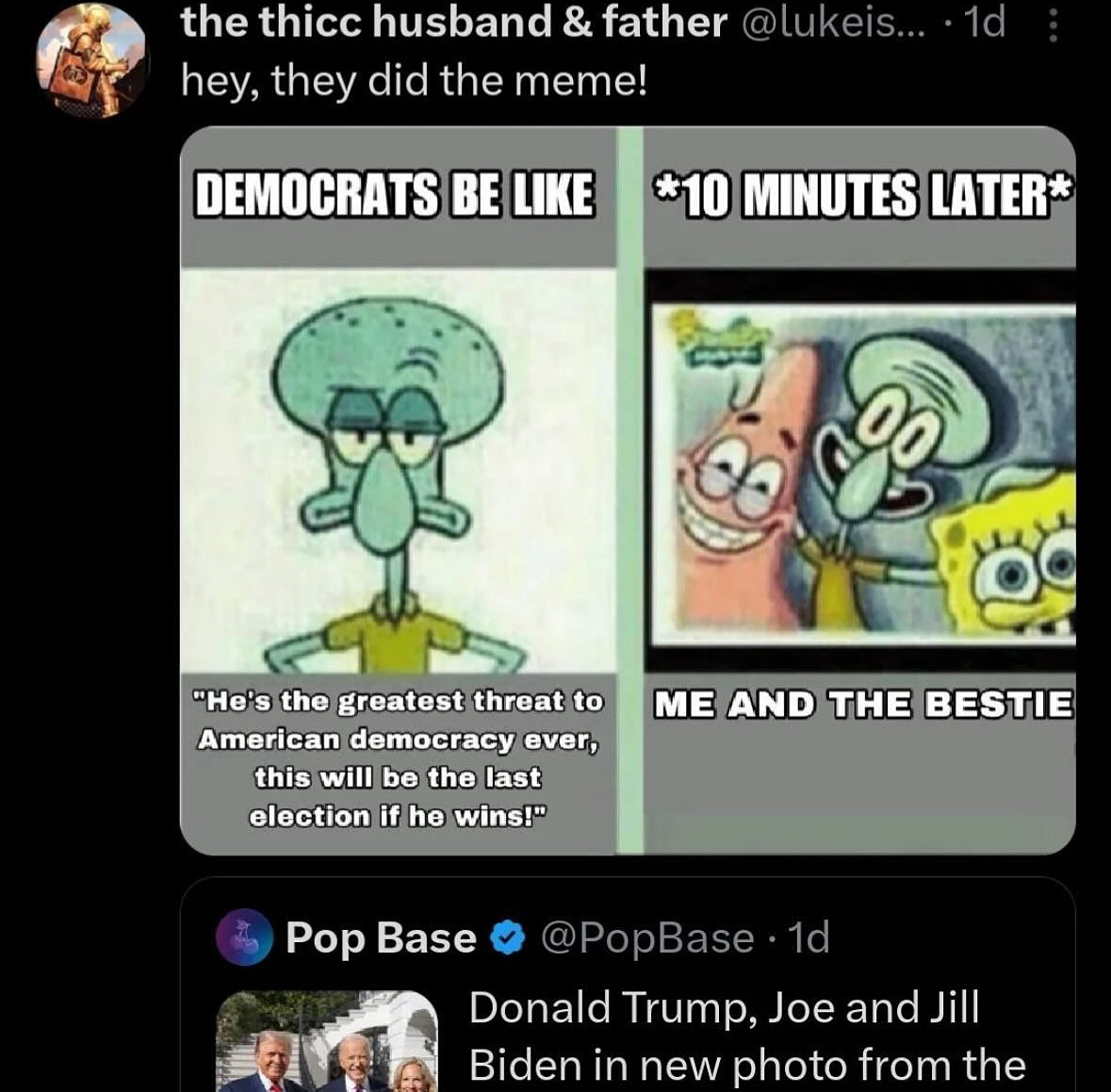 arrow-up1309arrow-down1imagelisten i know we ran on the platform that this man is evil but asking us to act like it is a little far?files.catbox.moespujb@lemmy.cafe to Political MemesEnglish · 1 year agomessage-square30linkfedilink