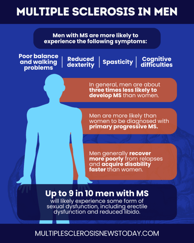 Multiple sclerosis (MS) in men may look different than MS in women. While the condition varies widely from person to person, research has shown that the risk of developing MS in men, as well as disease symptoms, early signs, and long-term outcomes, all tend to differ from those seen in women.