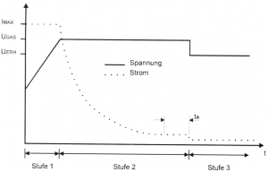 - Mit dieser Spannung weiterladen, bis sich der Strom eine Zeit (tik) nicht mehr ändert.