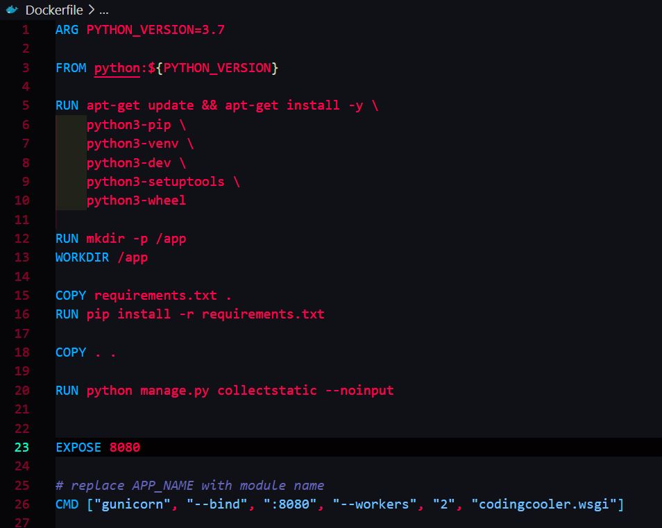 CMD ["gunicorn", "--bind", ":8080", "--workers", "2", "yourappname.wsgi"]