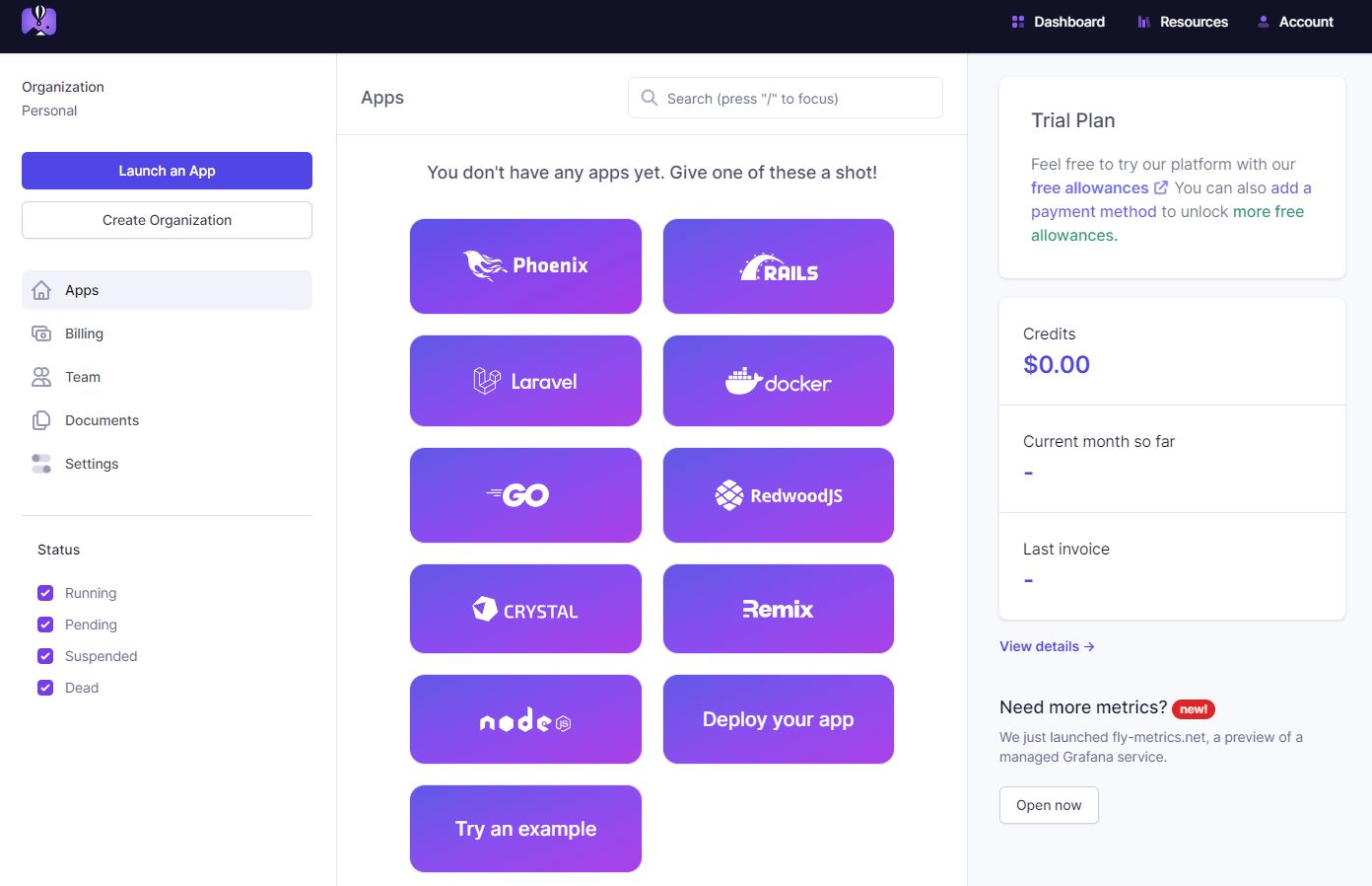 flyctl launch. And if this gives you an error you can run with the latest flyio docker image using :flyctl launch --image flyio/hellofly:latestor change the command to match the dockerimage in your app. - Add an app name, choose the closest server to you, and select