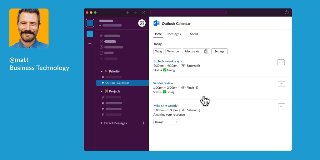 Some users might not realize they need to complete this extra authentication step in order to use a Slack app. As an admin, you can bypass this hurdle for the Google Calendar or Outlook Calendar app by using domain-wide authentication, a centralized way to authenticate all accounts on your team. Once a user is authenticated, they’ll receive a series of onboarding tips from the app, helping them understand how to get the most out of the app.