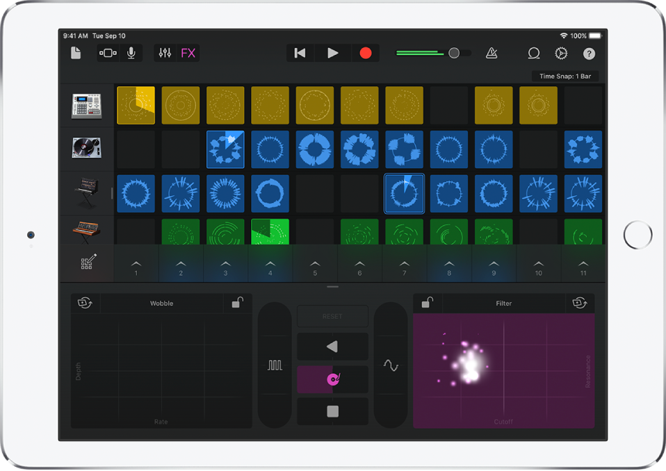 يمكنك استخدام Live Loops لإنشاء موسيقى إلكترونية عن طريق الضغط ببساطة على الخلايا والأعمدة في الشبكة لتشغيل تكرارات حلقية موسيقية. يمكنك إنشاء التوزيعات الخاصة بك، ثم ارتجال عرض Live Loops وتسجيله.