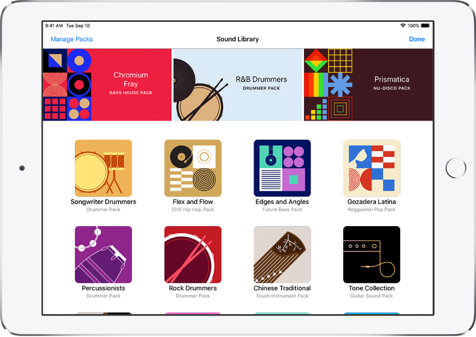 يمكنك استخدام مكتبة الأصوات لتنزيل حزم الأصوات التي تحتوي على مئات التكرارات الحلقية والأصوات والآلات الموسيقية التي تعمل باللمس وعُدد الطبول والمزيد وإدارتها. يقوم GarageBand بإعلامك عند توفر حزم صوتية جديدة للتنزيل.