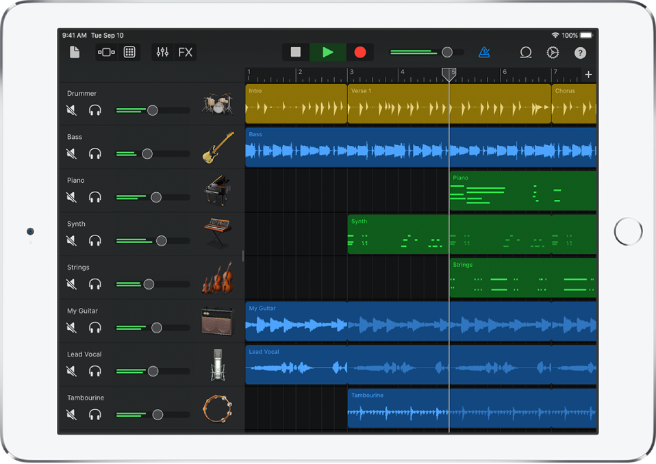يمكنك الاختيار من بين المئات من ملفات Apple Loops لإضافتها إلى أغنيتك وإضافة طبال يعزف أثناء الموسيقى المسجلة وخلط الأغنية بالمكوّنات الإضافية للتأثيرات.