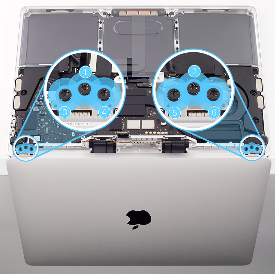 Use the T8 screwdriver to partially reinstall the six T8 screws (923-05266) into the display hinges in the order shown.