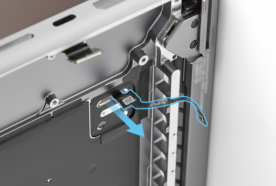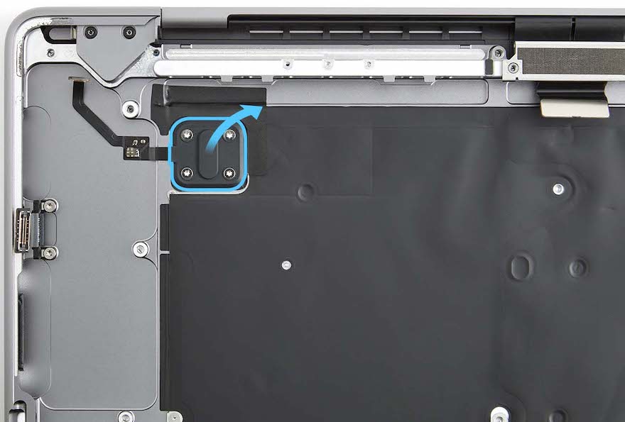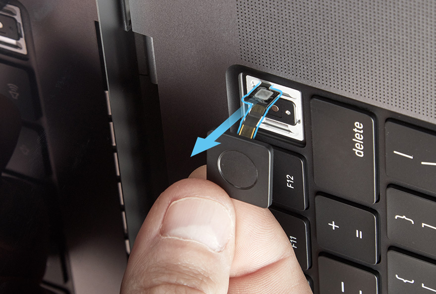 Hold the Touch ID button. Route the Touch ID board flex cable through the slot in the top case to remove the Touch ID board.