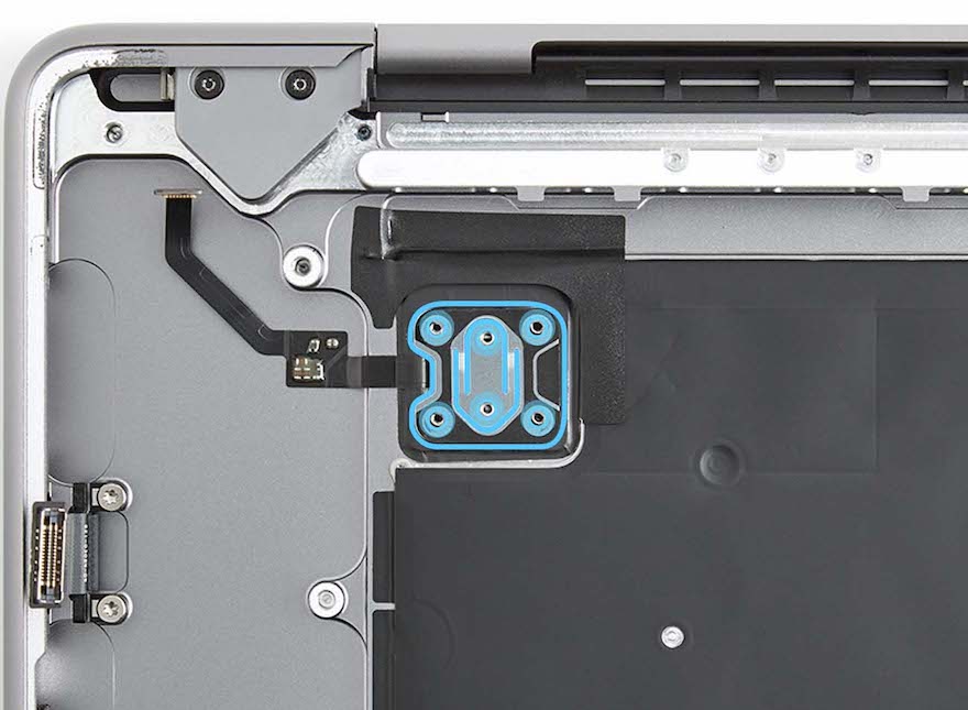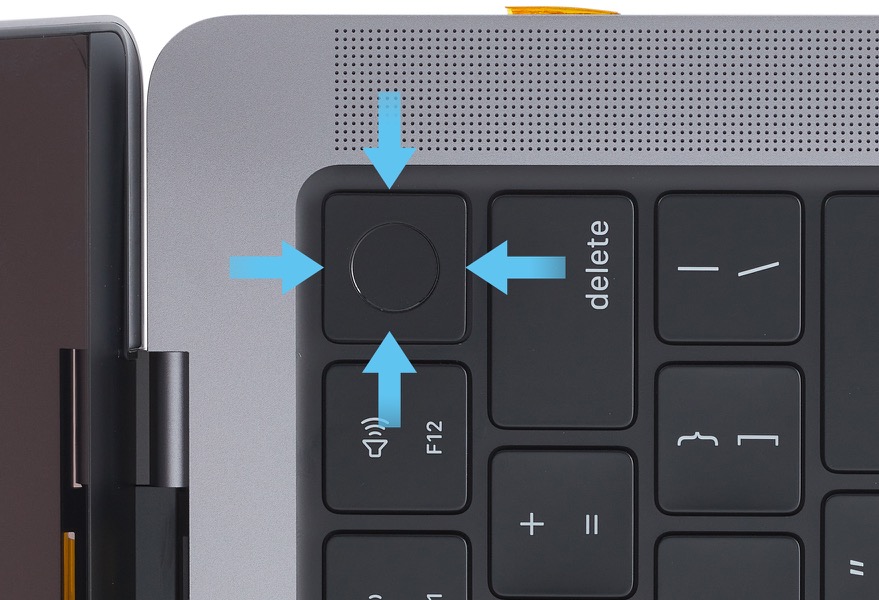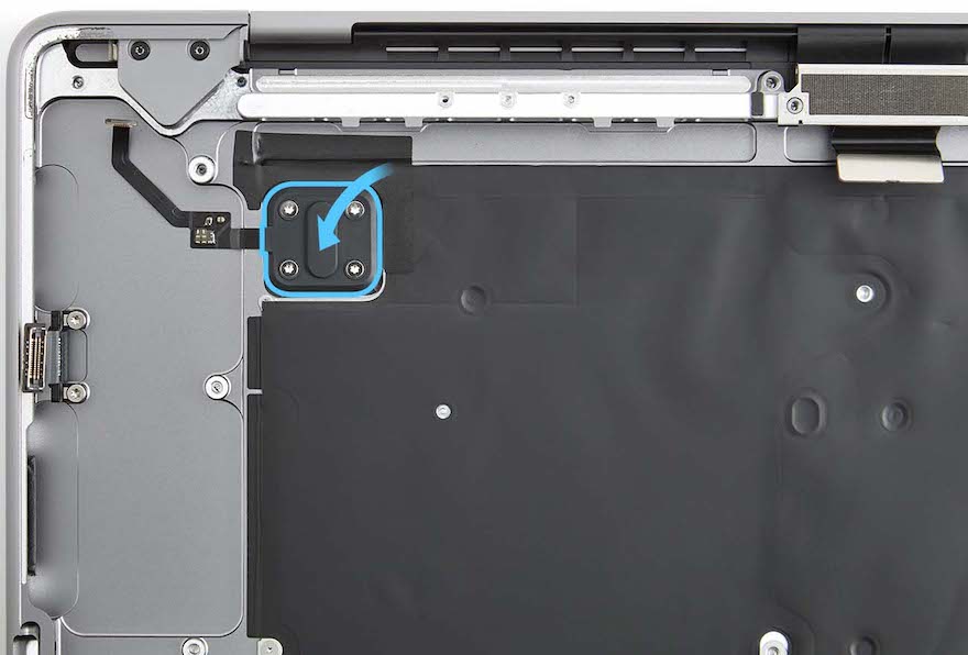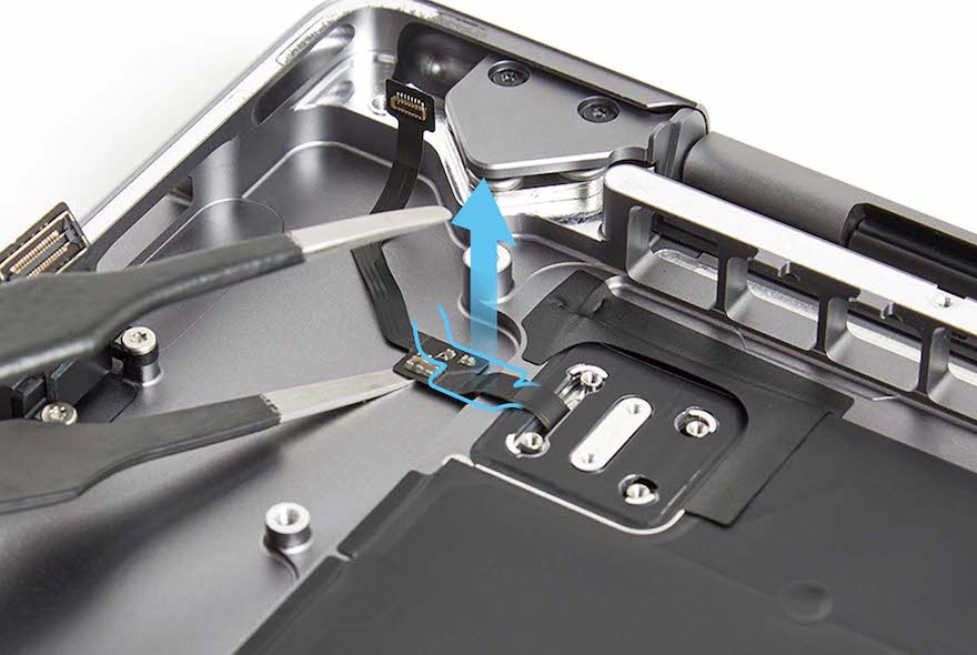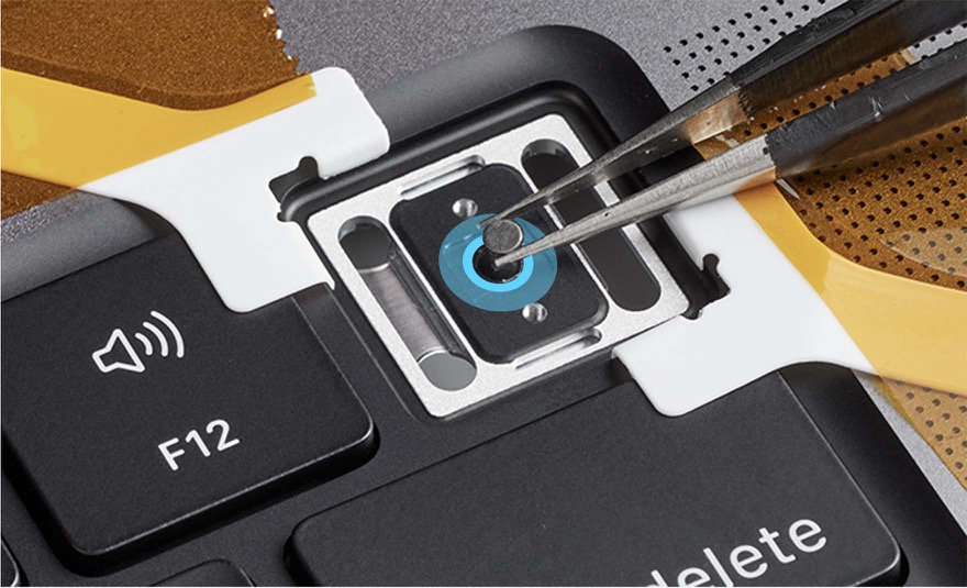 Place the computer right side up with the display still open. Spread the tips of the ESD-safe tweezers and use one tip to remove the shim from the circular recess under the Touch ID board.