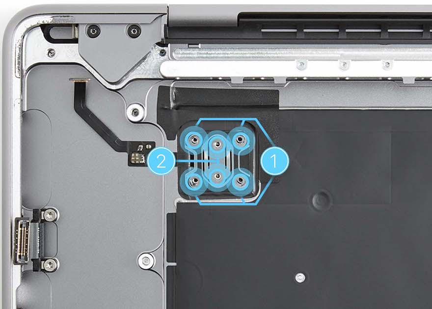 Look directly over the Touch ID button. The spaces on each side should appear equal, and the Touch ID button should align with the function keys. If the gaps around the sides are unequal, loosen the Touch ID board flexible cowling screws. Then repeat reassembly steps 12 through 16.