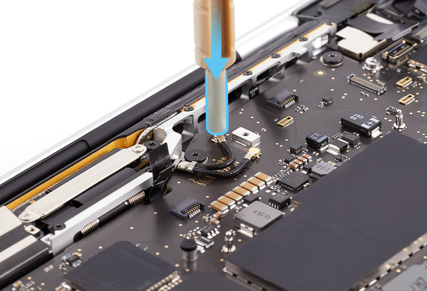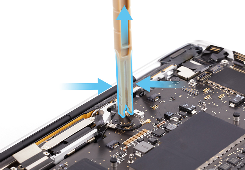Use the antenna tool to lift the ends of the two antenna coaxial cables off the connectors.