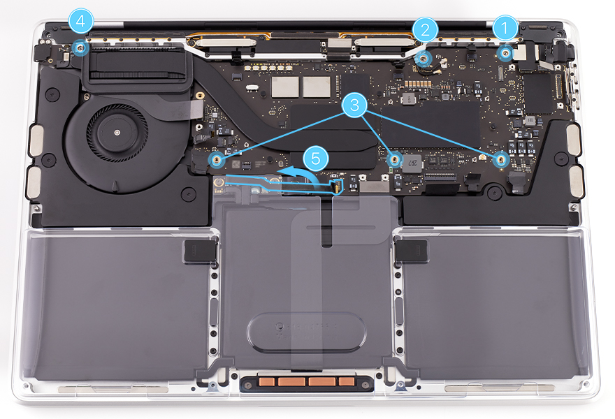 Lift the ends of the following five flex cables (1–5) off the connectors on the logic board: