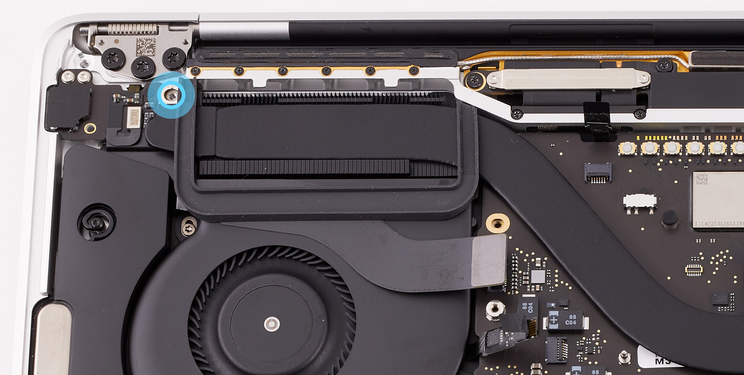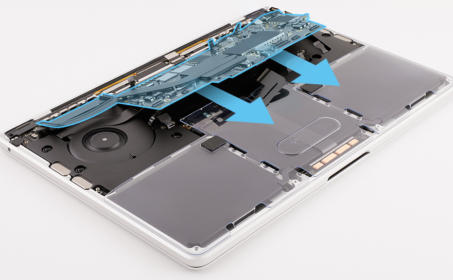 Gently tilt up up the edge of the logic board farthest from the display hinge. Then pull the logic board toward you and out of the top case. Move the cables out of the way as you remove the logic board.
