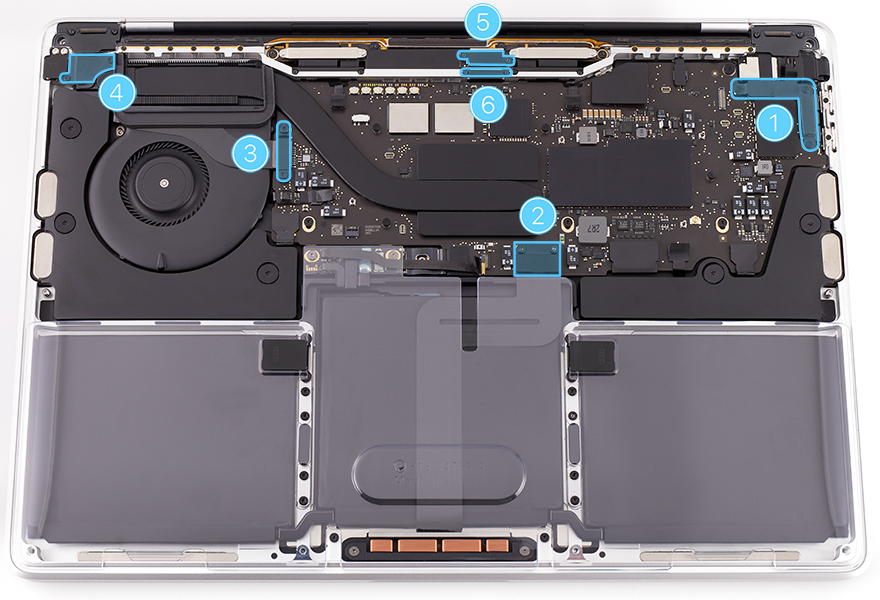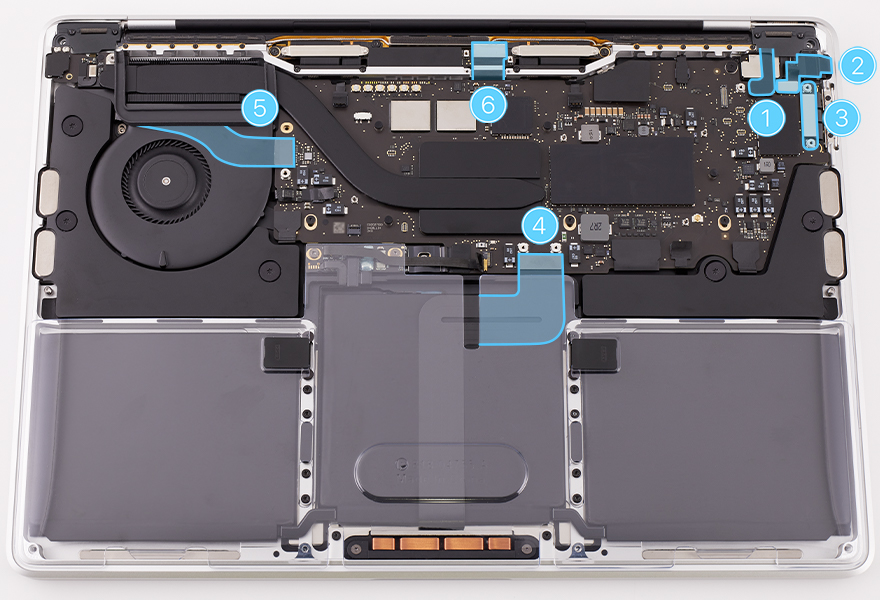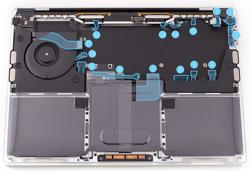 Note: There are 16 cables total, but the eDP flex cable with connector cowling is attached to the logic board and isn’t included in this image.