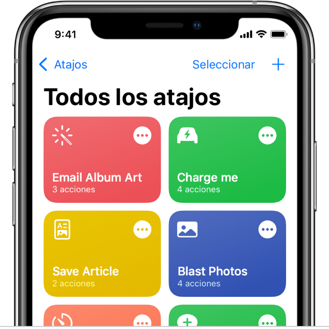 La galería incluye una colección de útiles y creativos atajos que han sido seleccionados. Explora la galería para echar un vistazo a las posibilidades que ofrecen los atajos y para ver cómo se crean. Cuando encuentres un atajo que te guste en la galería, añádelo a tu colección de atajos con solo pulsar la pantalla y personalízalo según tus necesidades.