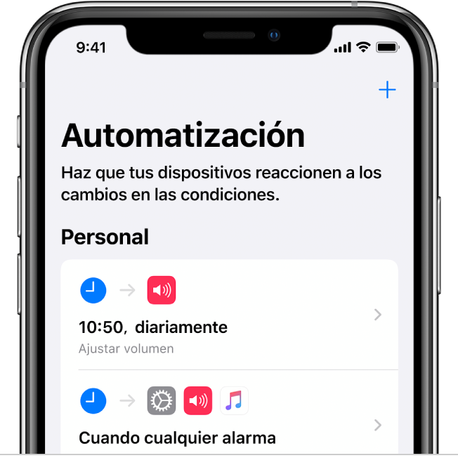 Una automatización es un tipo de atajo que se activa mediante un evento, en lugar de una activación manual. Puedes usar la app Atajos para configurar una automatización de casa o personal y hacer que el atajo automatizado se active con tu llegada o salida, con una configuración en tu iPhone, con una hora del día y con muchos eventos más.